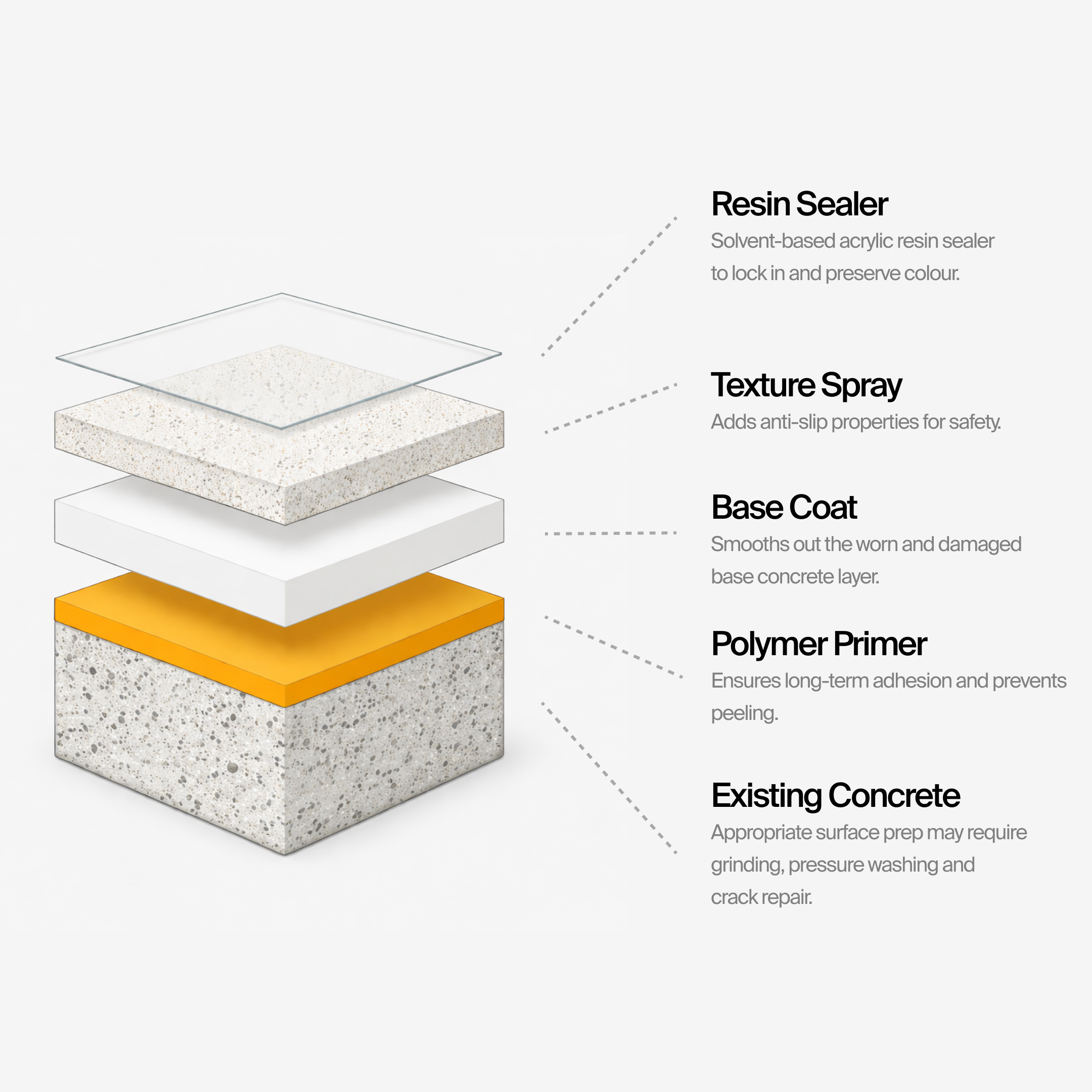 Each layer plays a specific role, from preparing the substrate to creating a durable protective finish. When applied correctly, this system improves adhesion, enhances colour, and significantly extends the lifespan of your concrete.